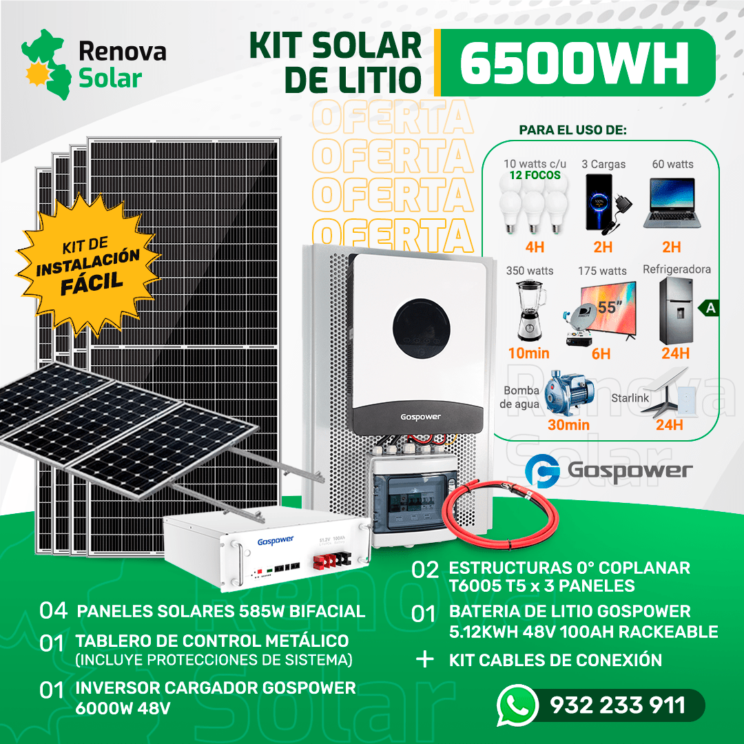 Kit solar Batería de Litio 6500Wh/día dimensionado para un uso exigente de electrodomésticos. Permite el uso de refrigeradora, starlink, televisor, bomba de agua, etc. Calculado para un uso diario todo el año.