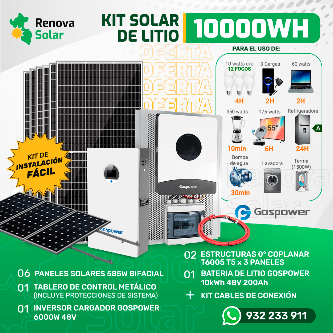 Kit Solar de Litio 10,000Wh – Gospower, diseñado para brindar autonomía, eficiencia y fácil instalación. Ideal para alimentar refrigeradoras, televisores, focos LED, laptops, lavadoras, bombas de agua y más, garantizando energía confiable las 24 horas. Perfecto para zonas sin red eléctrica o para reducir tu consumo de luz con energía limpia y renovable.
